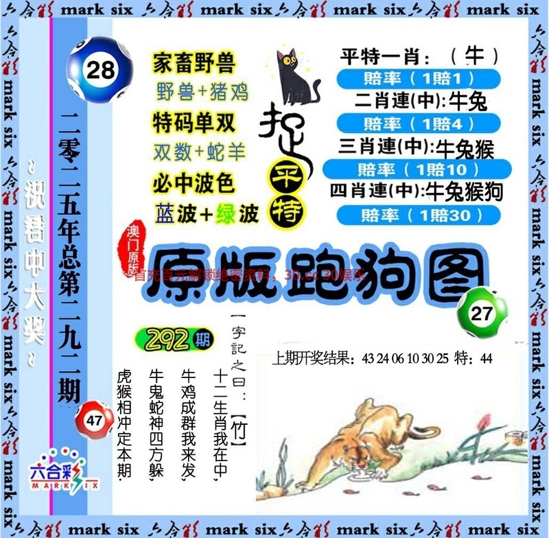 291期九肖 | 狗猪兔虎牛马猴蛇鸡 | 开:狗44 |